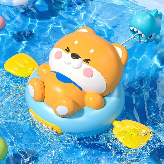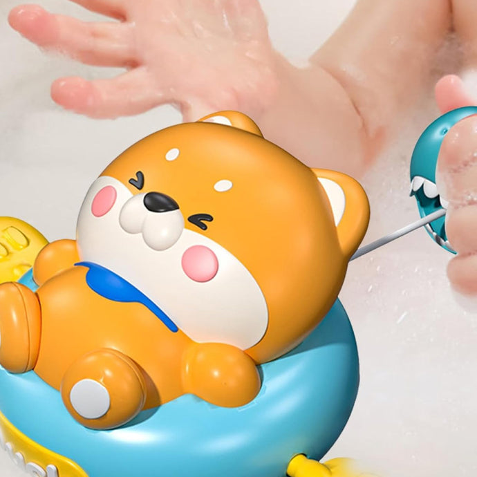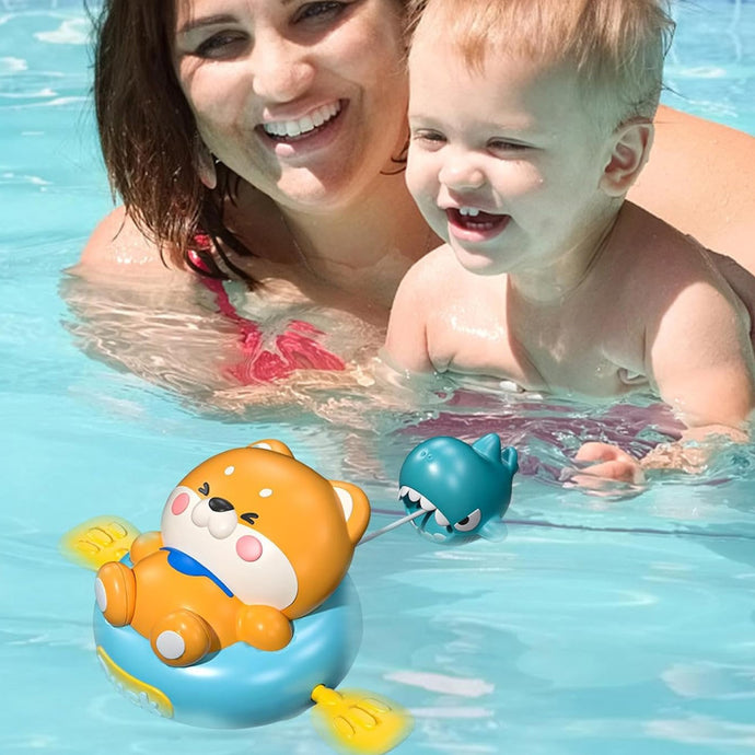 Pull the string and watch the cute animal paddle away from the chasing shark with our Rotating Swimming Bath Toy! This dual-function toy is perfect for bathtub fun and dry-ground play. With an easy-grip string, itβs ideal for little hands. Perfect for babies aged 1+.