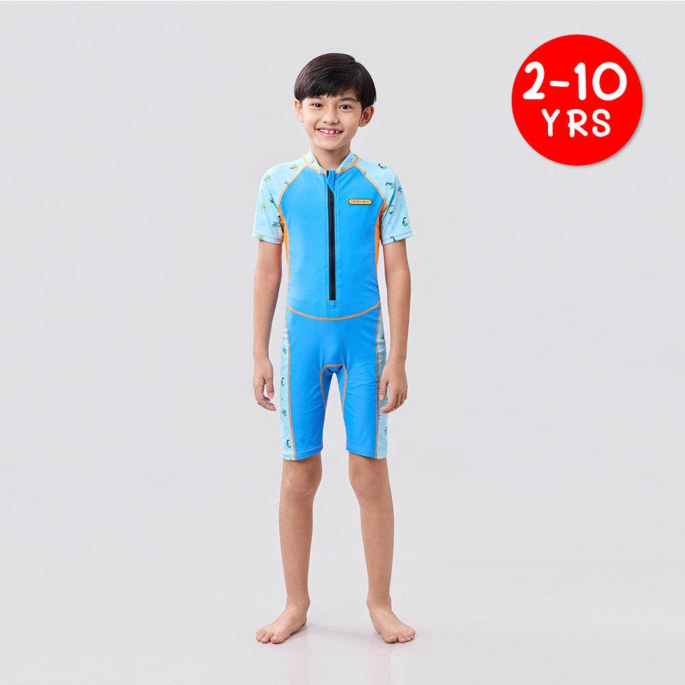 Crafted from a blend of nylon and spandex, it’s lightweight, stretchable, and quick-drying, keeping your little one comfy in and out of the water. Its front zipper makes it easy for little ones to wear independently. Gentle on sensitive skin, it’s available in sizes 2 to 10 years old.