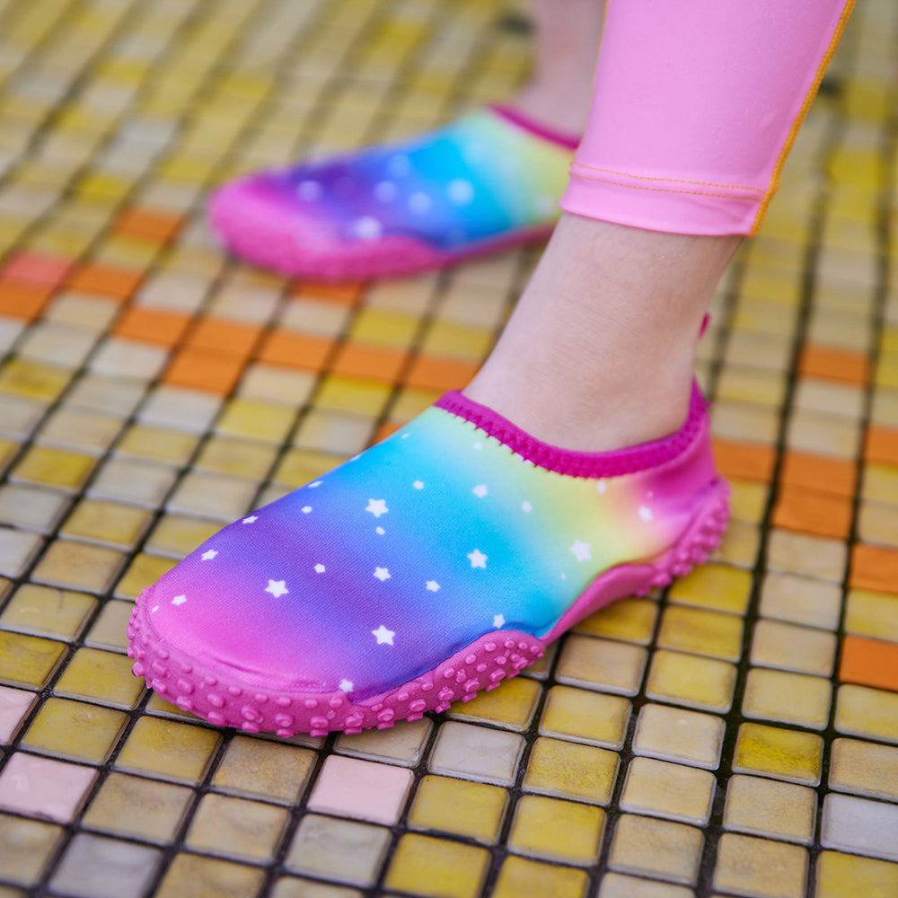 These ideal water shoes allow your toddler to explore the water in both comfort and style. Designed for kids aged 2-10, the Pink Rainbow Aqua Shoes showcase a fun and cheerful pink that little ones will love. Lightweight and versatile, they're perfect non slip pool shoes for your kids.