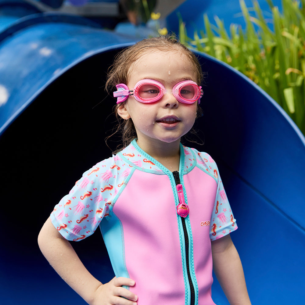 Adjust the straps to fit your child's face. Position your child's goggles' nose bridge to minimise gaps. Make sure the lenses cover their eyes comfortably. Pull the stretchable straps at their heads and tighten them evenly on both sides for a snug but not too tight fit. Adjust for a snug and secure fit as your child grows.