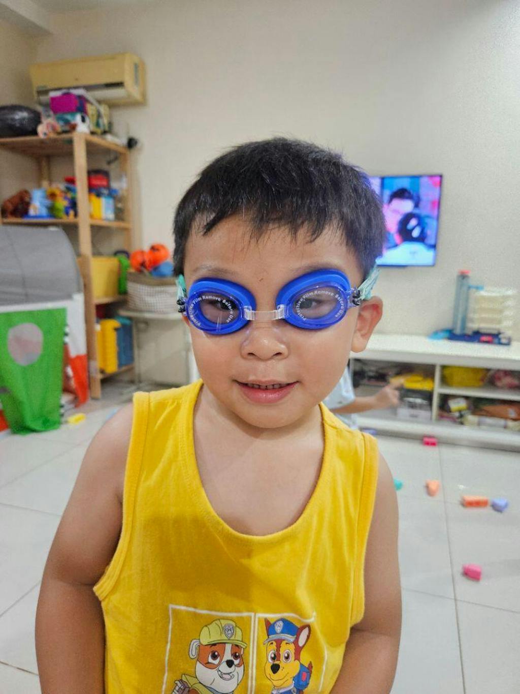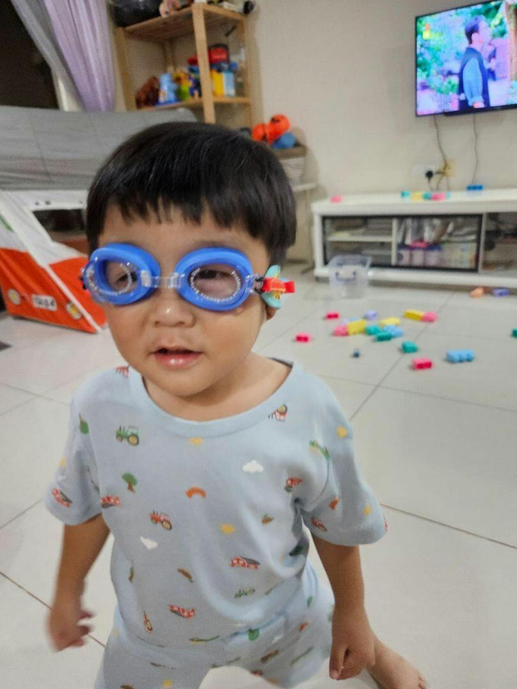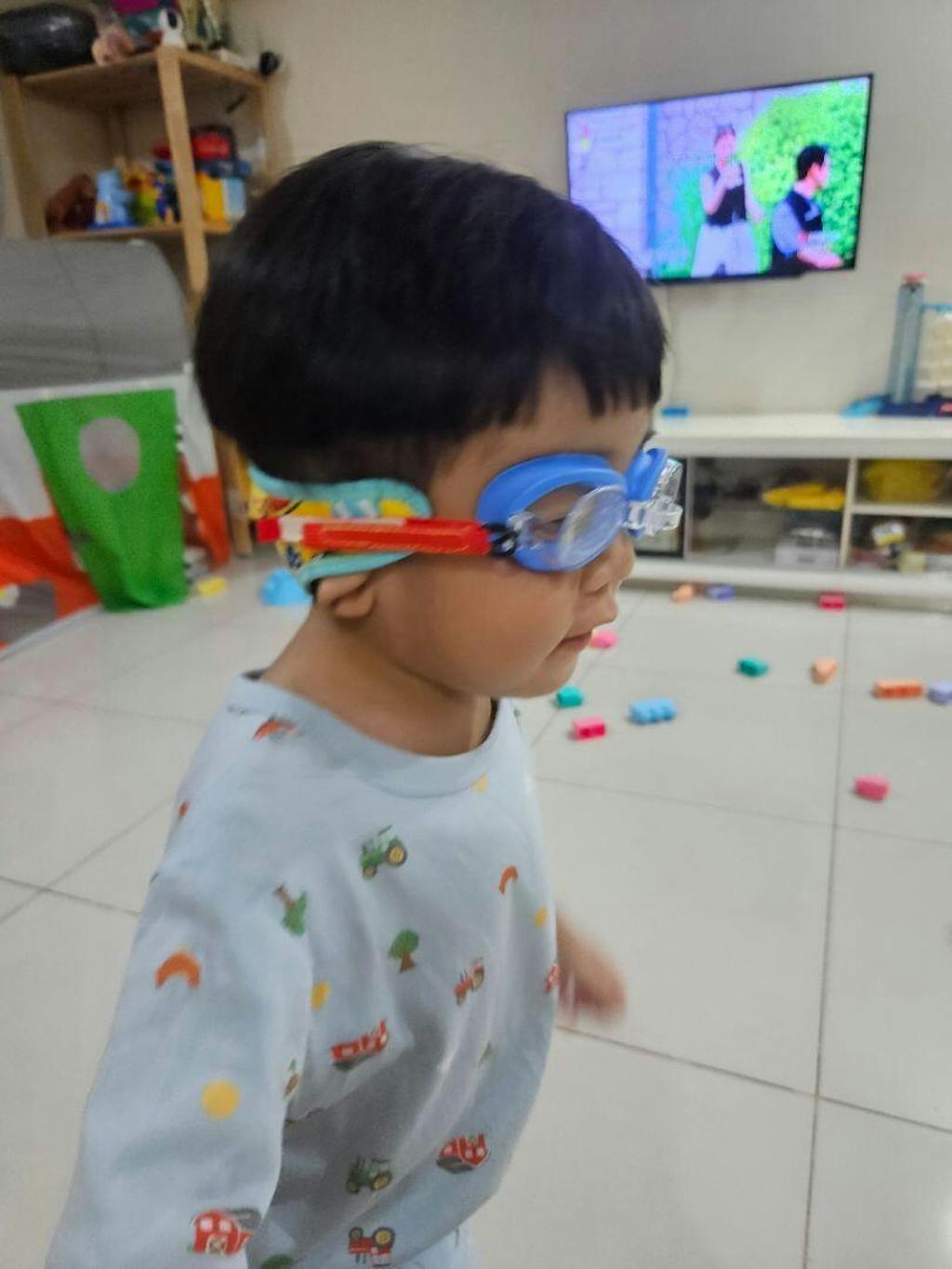 Adjust the straps to fit your child's face. Position your child's goggles' nose bridge to minimise gaps. Make sure the lenses cover their eyes comfortably. Pull the stretchable straps at their heads and tighten them evenly on both sides for a snug but not too tight fit. Adjust for a snug and secure fit as your child grows.