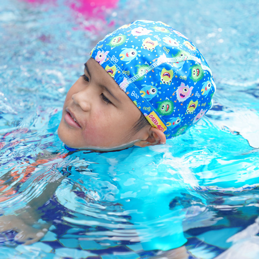 This blue swimming cap features a fun and playful monster design, perfect for children aged 2 to 8 years old. This swim cap keeps your child's hair in place. Moreover, Cheekaaboo's Protective Toddler Swim Cap dries rapidly, allowing post-swim comfort.
