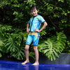 This two piece blue bathing suit features a blue shark design and is a part of the Under The Sea Collection! We inspire to spark the imagination of kids swimming alongside majestic blue sharks and discovering hidden treasures of the sea. Your little one will feel like a true ocean explorer!