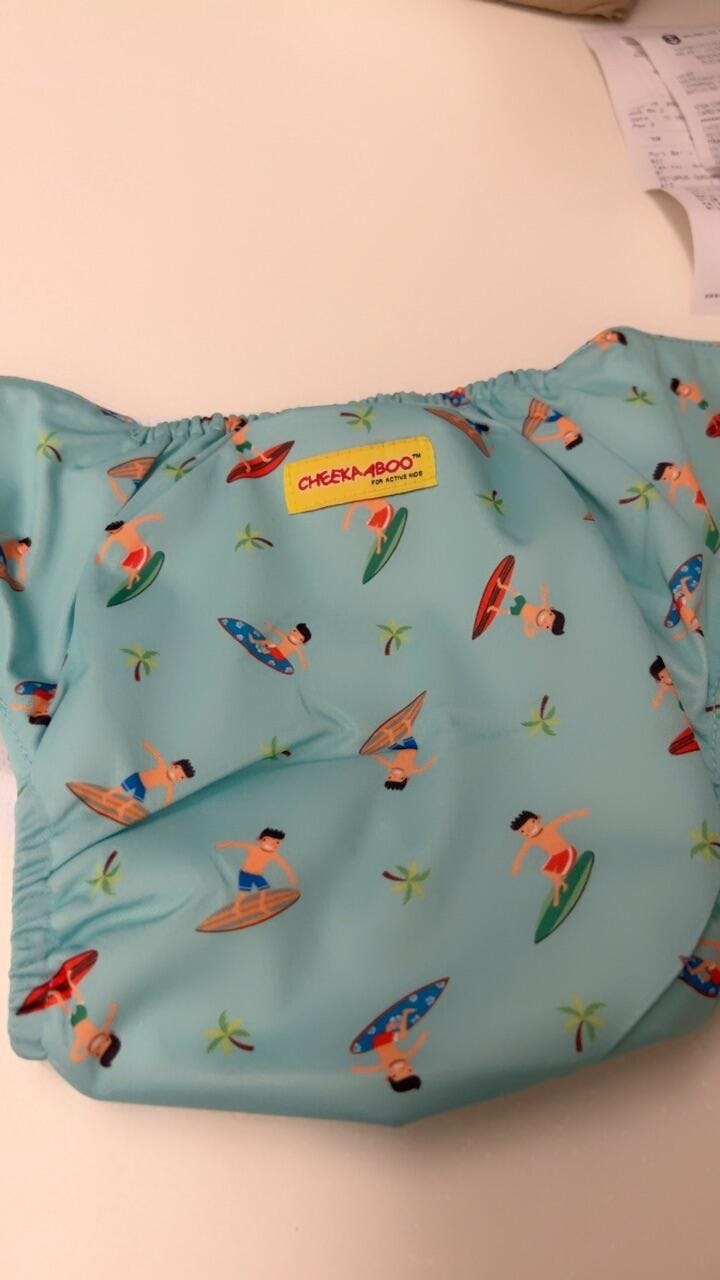 Cheekaaboo's reusable waterproof diapers keep your baby protected and comfortable while enjoying water activities. This Baby Reusable Swim Diaper - Surfer is washable and features an absorbent cotton insert and a waterproof outer layer. You can remove the insert and use the waterproof layer for swimming. The diaper also includes adjustable button snaps, ensuring a secure fit for growing babies aged 6 to 36 months.