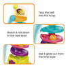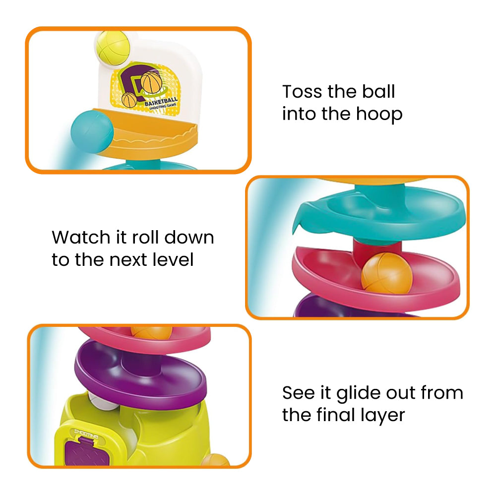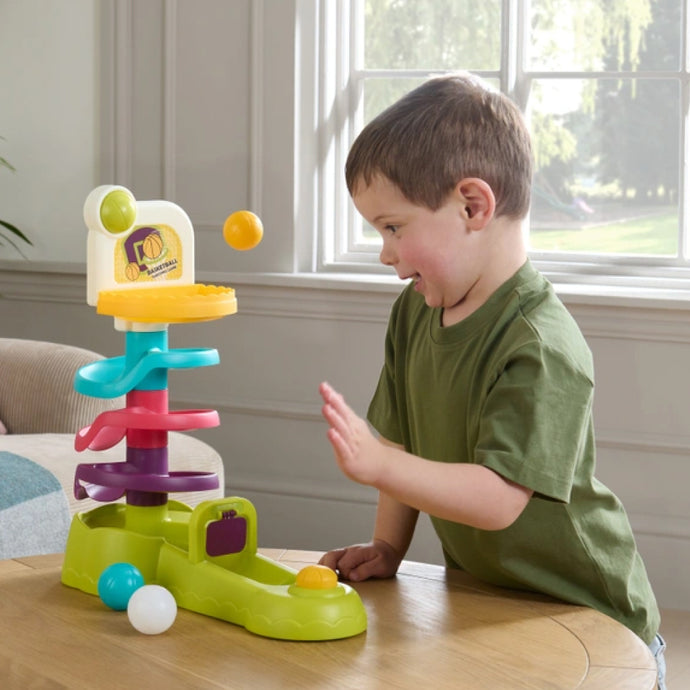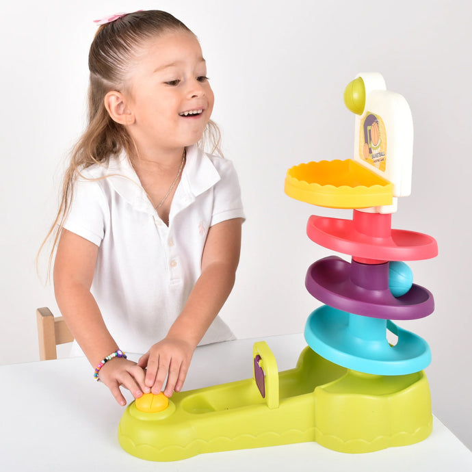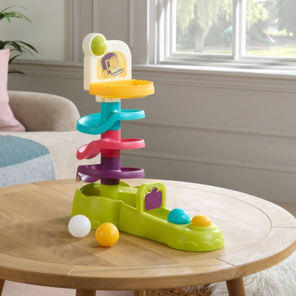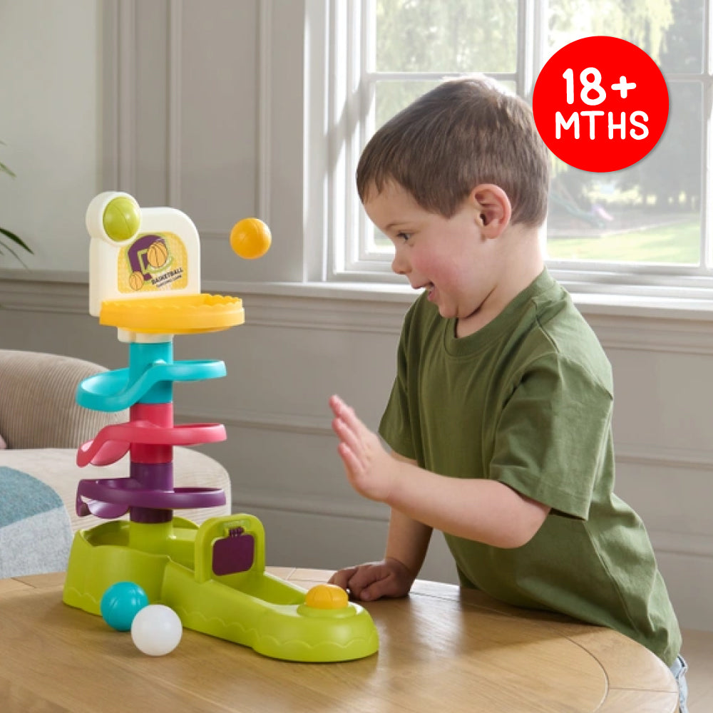 Bring fun and learning together with this interactive track and shoot basketball toy. Toddlers press a button to launch balls, watch them slide down a track, then try to score in the hoop. Great for hand-eye coordination, cause and effect play, and parent-child bonding.